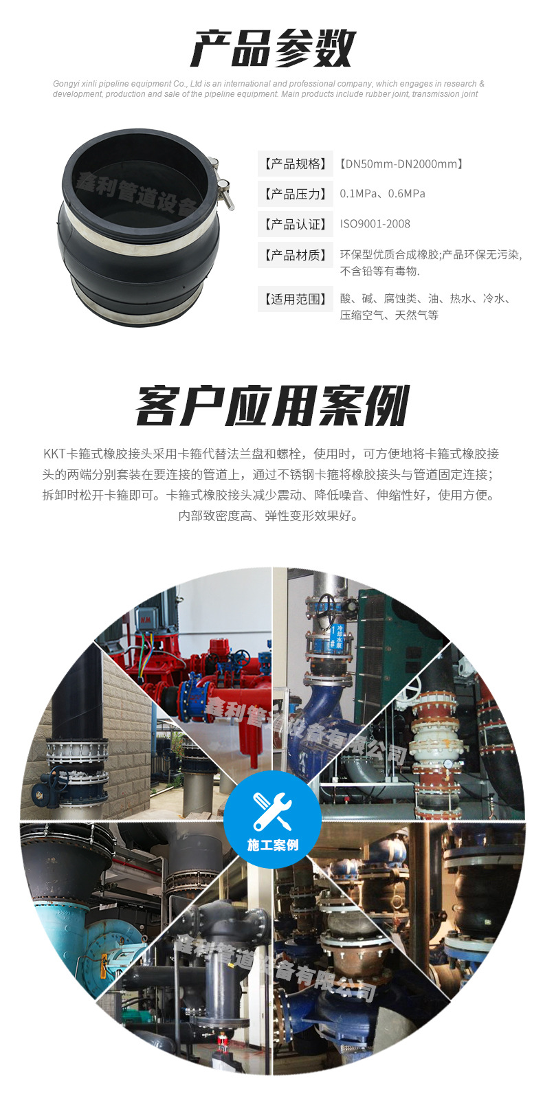 橡膠軟接頭選用管箍來(lái)替代法蘭片和地腳螺栓,應(yīng)用時(shí)可便捷地將管箍式橡膠軟接頭的兩支管各自套服在要邊接的管路上,根據(jù)管箍將橡膠軟接頭與管路固定不動(dòng)聯(lián)接;拆裝時(shí)松掉上述管箍就可以。進(jìn)而做到補(bǔ)償管路因熱漲冷縮,通水所造成的偏移量之目地。在管箍式橡膠軟連接的生產(chǎn)過(guò)程中,內(nèi)部硫化橡膠層的鋼簾線紡織物和硫化橡膠未緊密聯(lián)系,進(jìn)而造成 內(nèi)部硫化橡膠層發(fā)生間隙。安裝后,工作壓力被抑止,水根據(jù)空隙注入里層。,造成 管箍式橡膠軟連接起泡并泄漏。