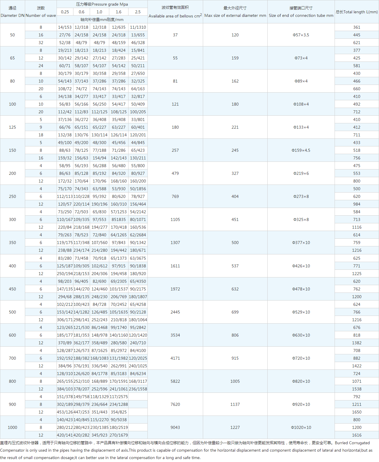 直埋內(nèi)壓式波紋補償器,適用于只有軸向位移的管路中,本產(chǎn)品具有補償橫向位移和軸向與橫向合成位移的能力,但因為補償量較小一般只做為軸向補償更能發(fā)揮其特性,使用壽命長,更安全可靠。Burried Corrugated Compensator is only used in the pipes having the displacement of axis.This product is capable of compensation for the horizontal displacement and component displacement of lateral and horizontal,but as the result of small compensation dosage,it can better use in the lateral compensation for a long and safe time.