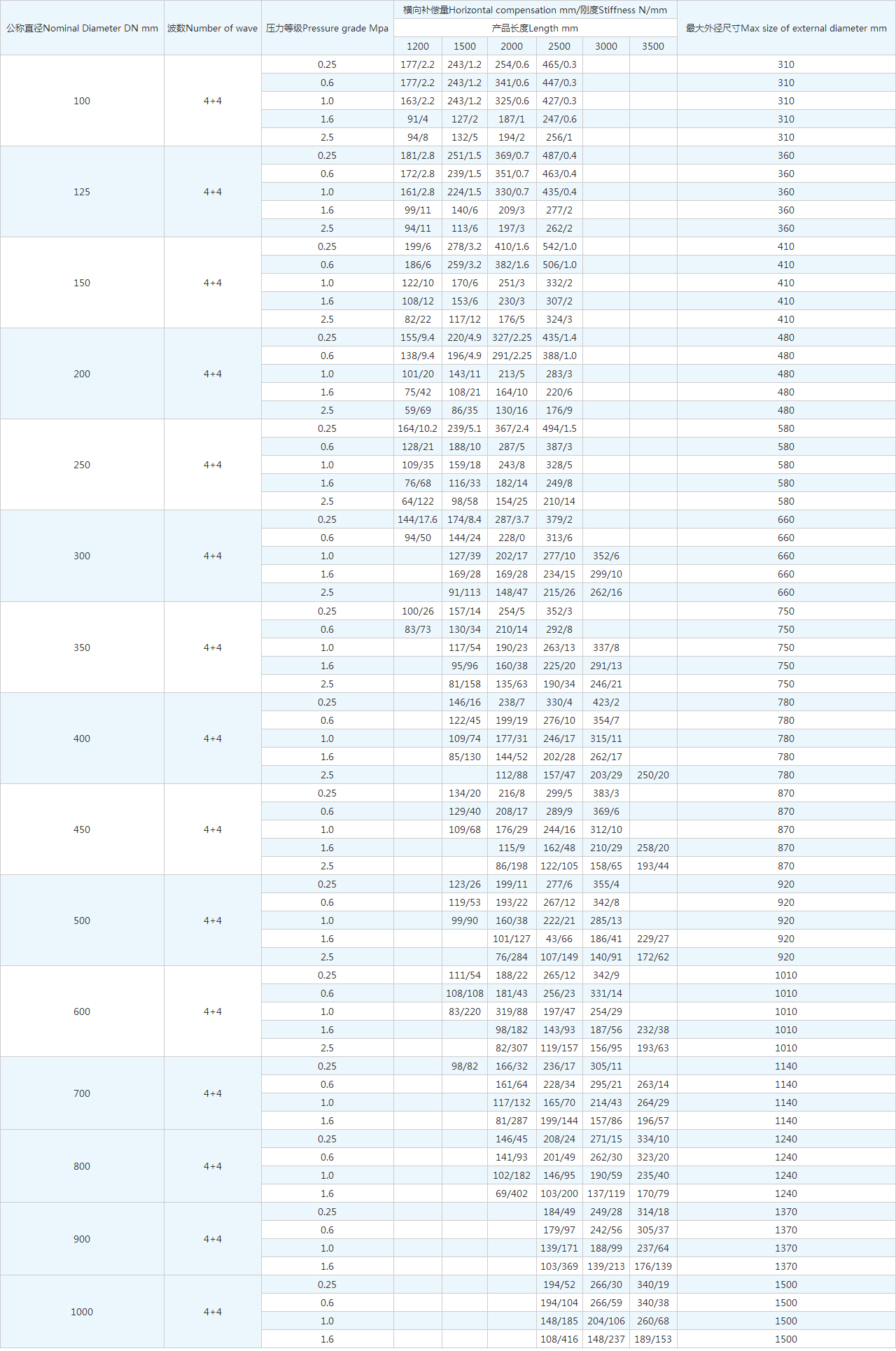 | 公稱直徑Nominal Diameter DN mm | 波數(shù)Number of wave | 壓力等級Pressure grade Mpa | 橫向補償量Horizontal compensation mm/剛度Stiffness N/mm | 很大外徑尺寸Max size of external diameter mm | |||||