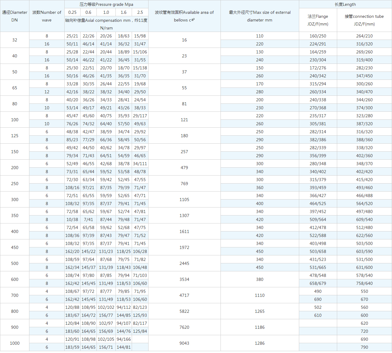 | 通徑Diameter DN | 波數(shù)Number of wave | 壓力等級(jí)Pressure grade Mpa | 波紋管有效面積Available area of bellows c㎡ | 很大外徑尺寸Max size of external diameter mm | 長(zhǎng)度Length | |||||