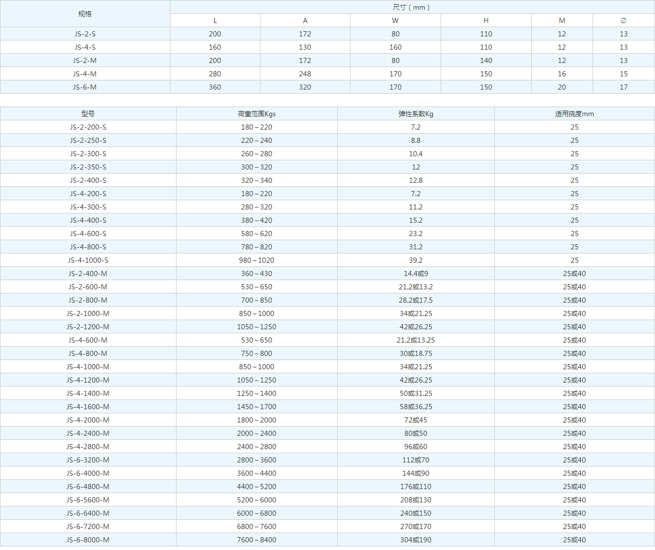 | 型號 | 荷重范圍Kgs | 彈性系數(shù)Kg | 適用撓度mm |