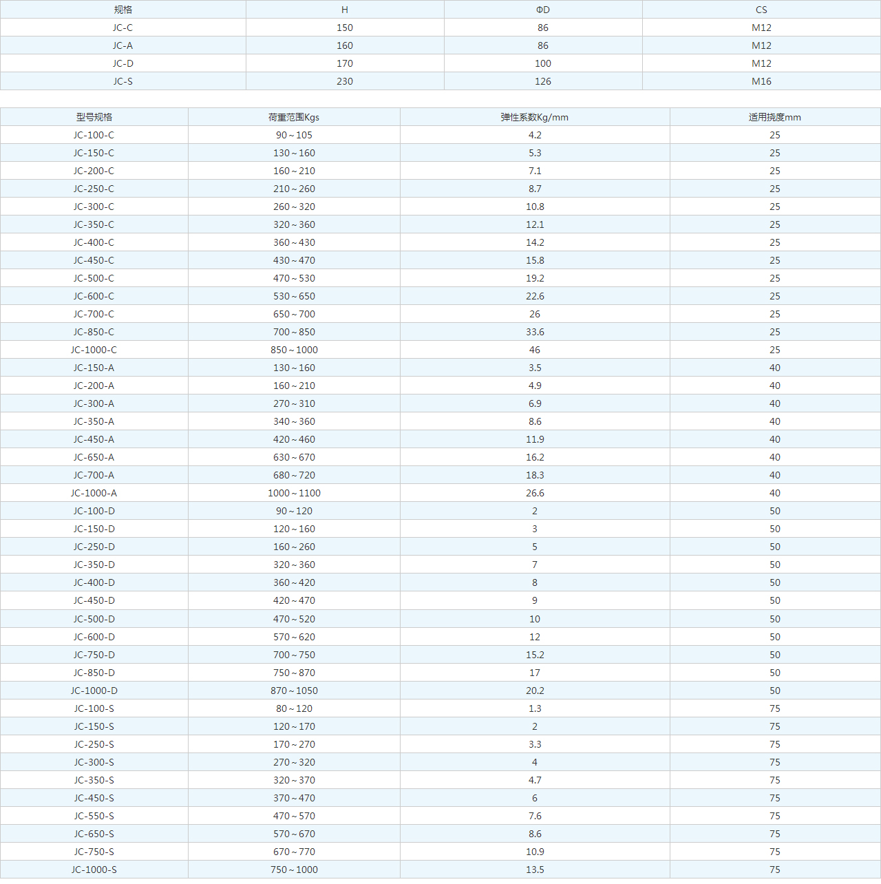 | 型號(hào)規(guī)格 | 荷重范圍(Kg) | 彈性系數(shù)(Kg/mm) | 適用撓度(mm) |