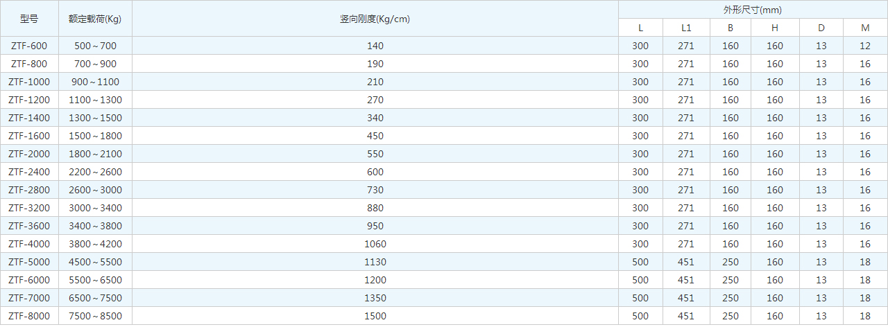 | 型號(hào) | 荷重范圍Kgs | 彈性系數(shù)Kg/mm |