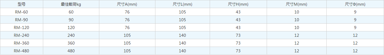 | 型號(hào) | 很佳載荷kg | 尺寸A(mm) | 尺寸L(mm) | 尺寸H(mm) | 尺寸M(mm) | 尺寸Ф(mm) |