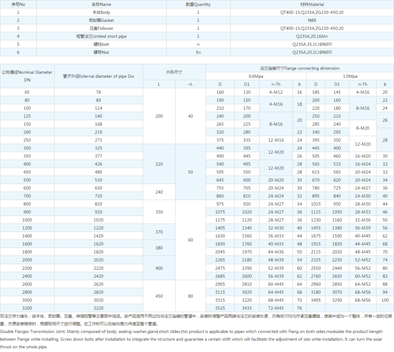 Double Flanges Transmission Joint: Mainly composed of body, sealing-washer,gland,short slides,this product is applicable to pipes which connected with Flang on both sides,modulate the product'slength between Flange while installing, Screw down bolts after installation to integrate the structure and guarantee a certain shift which will facilitate the adjustment of size while installation. It can turn the axial thrust on the whole pipe.