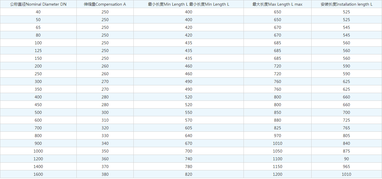 | 公稱直徑Nominal Diameter DN | 伸縮量Compensation A | 很小長度Min Length L 很小長度Min Length L | 很大長度Max Length L max | 安裝長度Installation length L |