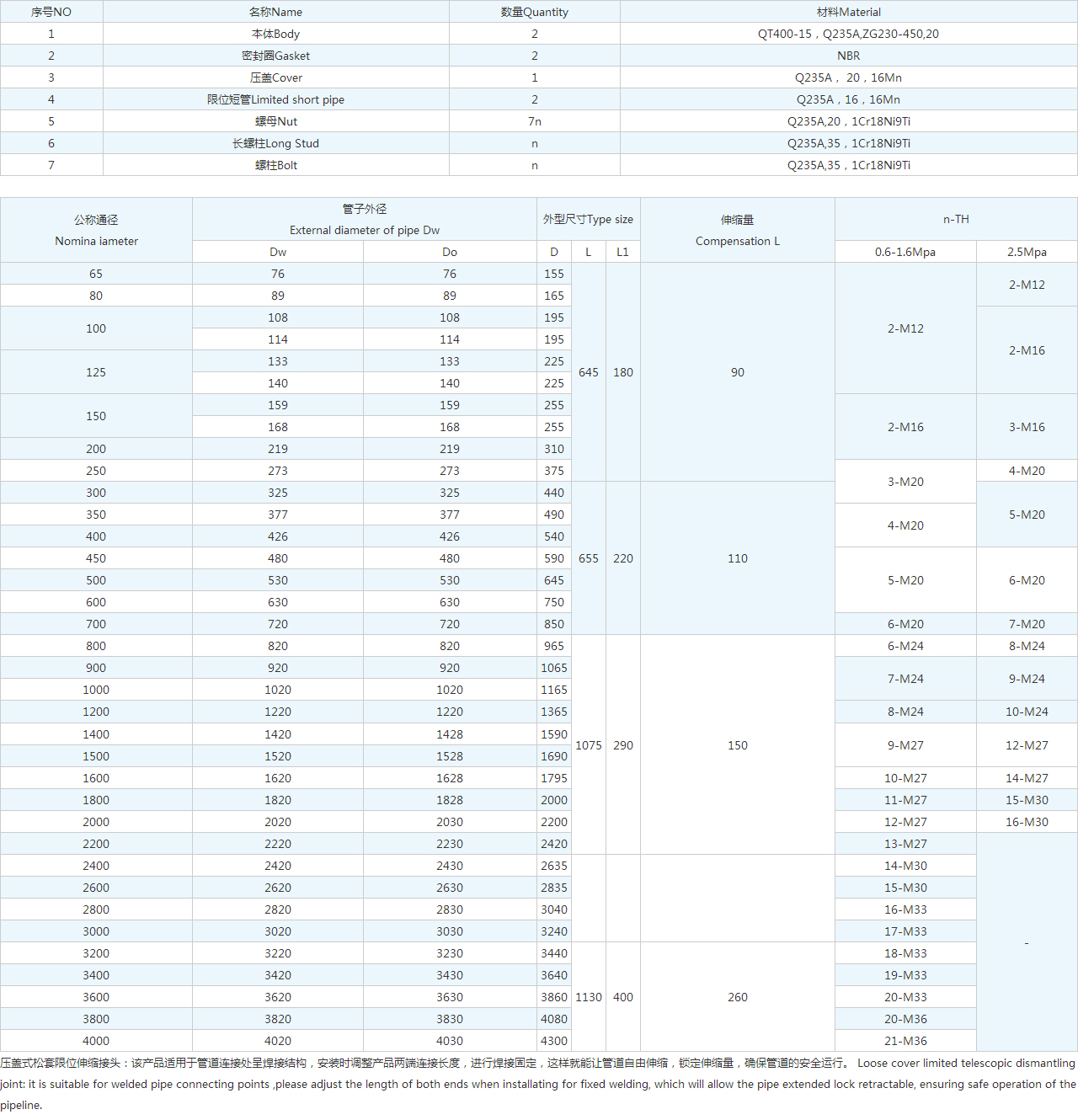 壓蓋式松套限位伸縮接頭:該產(chǎn)品適用于管道連接處呈焊接結(jié)構(gòu),安裝時調(diào)整產(chǎn)品兩端連接長度,進(jìn)行焊接固定,這樣就能讓管道自由伸縮,鎖定伸縮量,確保管道的安全運行。 Loose cover limited telescopic dismantling joint: it is suitable for welded pipe connecting points ,please adjust the length of both ends when installating for fixed welding, which will allow the pipe extended lock retractable, ensuring safe operation of the pipeline.